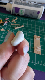 To size the food correctly, I started with a table and two size references: the people and the table itself. The table was made of coffee stirrers, which are easy to cut with side cutters or a sharp X-Acto knife, making them a versatile choice for crafting. I made the seats first so I could reference the table height accurately. One bench used one long coffee stirrer for the seat and two shorter pieces for legs, providing a sturdy yet simple design. While the glue dried, I laid four coffee stirrers side by side for the tabletop and glued two shorter pieces perpendicularly to hold them together securely. Once dry, I cut the legs at roughly a 45° angle and glued the cross sections to ensure that the table would be stable and ready for the feast.