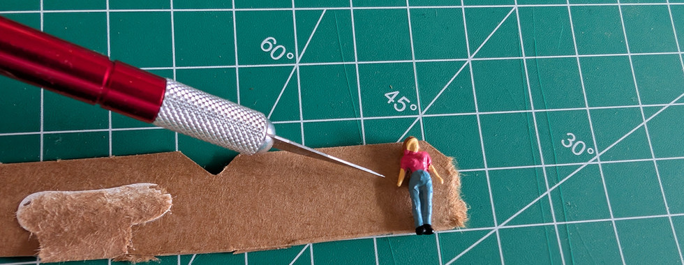 To check accuracy, use an HO-sized figure as a size reference next to the clay. After cutting your clay, gently move the pieces to a sheet of parchment paper using the blade of the knife and tweezers.
