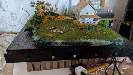 After all buttons are installed, I glued the board with the buttons to a second piece of foam (painted black) with a large hole in the center. This allows for easy movement of the diorama and wires.